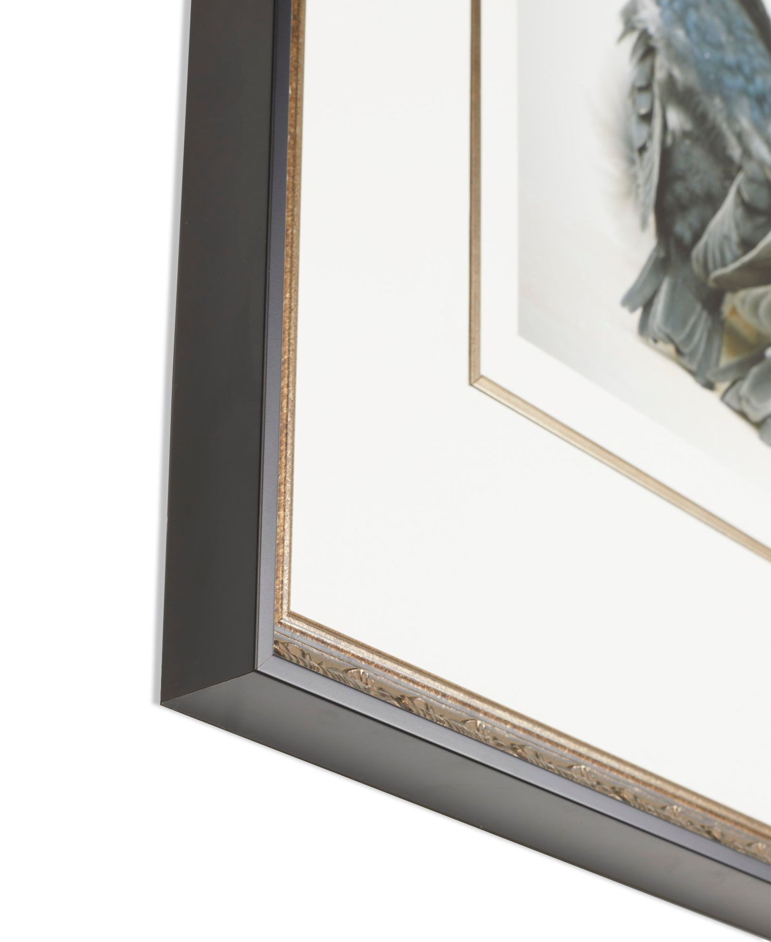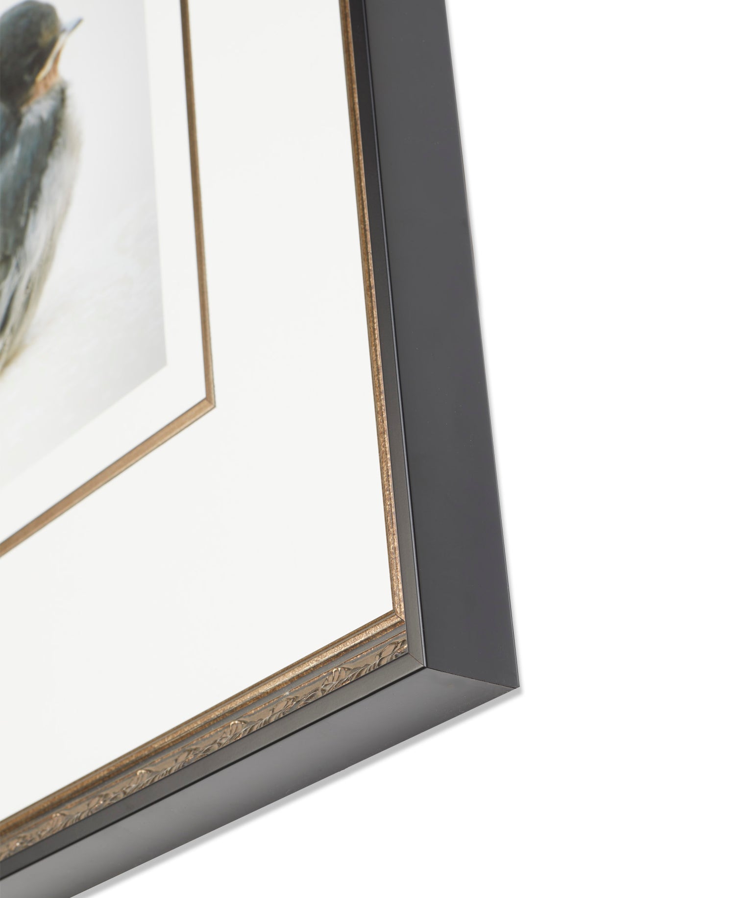 Encased within a stunning classical ornate gold and black frame. Fitted with a gold fillet to match and bordered by a pristine white mat.