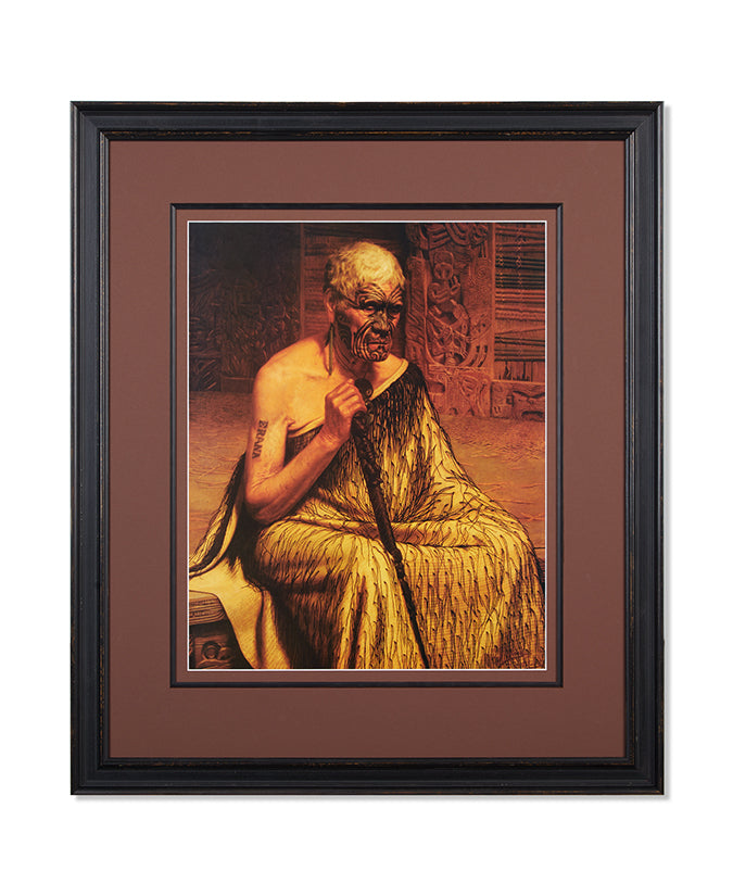 A portrait of Te Aho-o-te Rangi Wharep of Ngti Mahuta. Reproduced from the original on fine art paper using lightfast inks. Framed in a double mount with a dark brown fillet to compliment the rustic dark frame using 99% UV glass.
