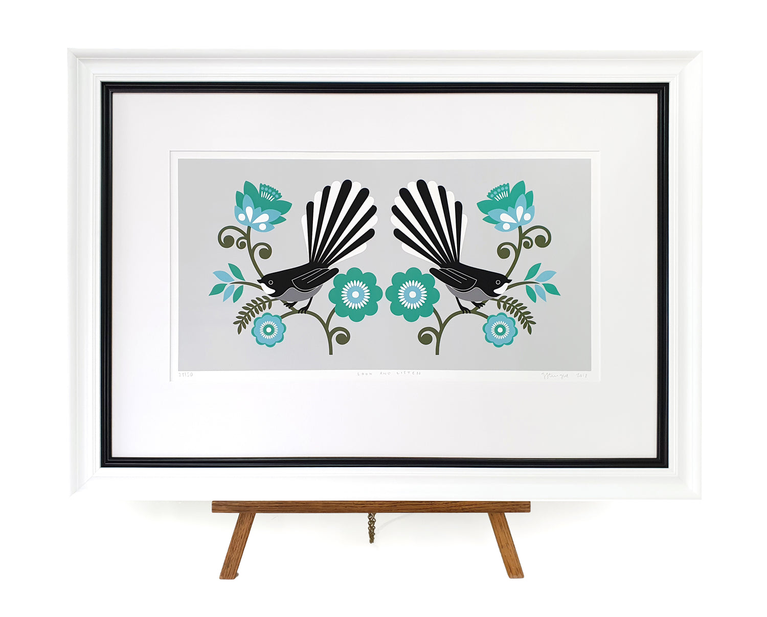 Framed using a stacked double frame, satin white with a smaller satin black inner. Glazed with conservation uv glass. Framed size 82x58cm