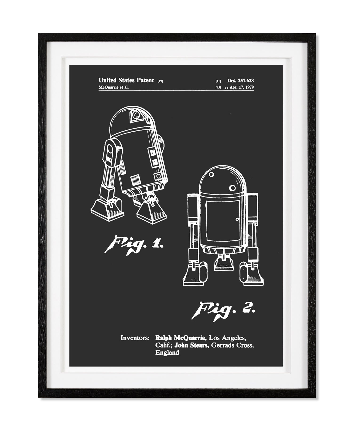 Art print reproduction of the original 1979 patent for everyone's favorite droid -R2-D2. The artwork employs a blackboard background complete with chalk smudging and light scratches to evoke an authentic vintage feel.